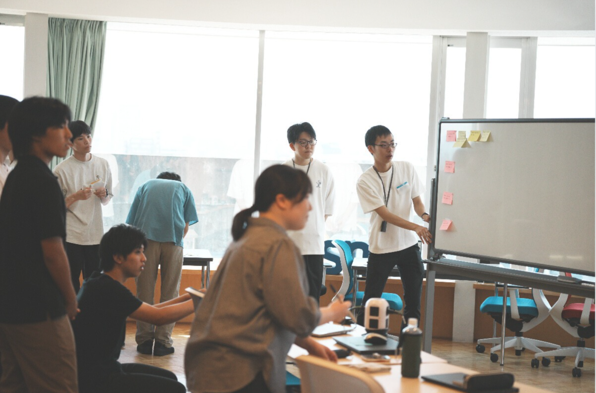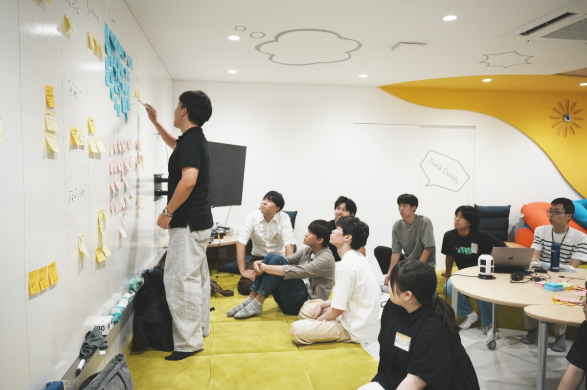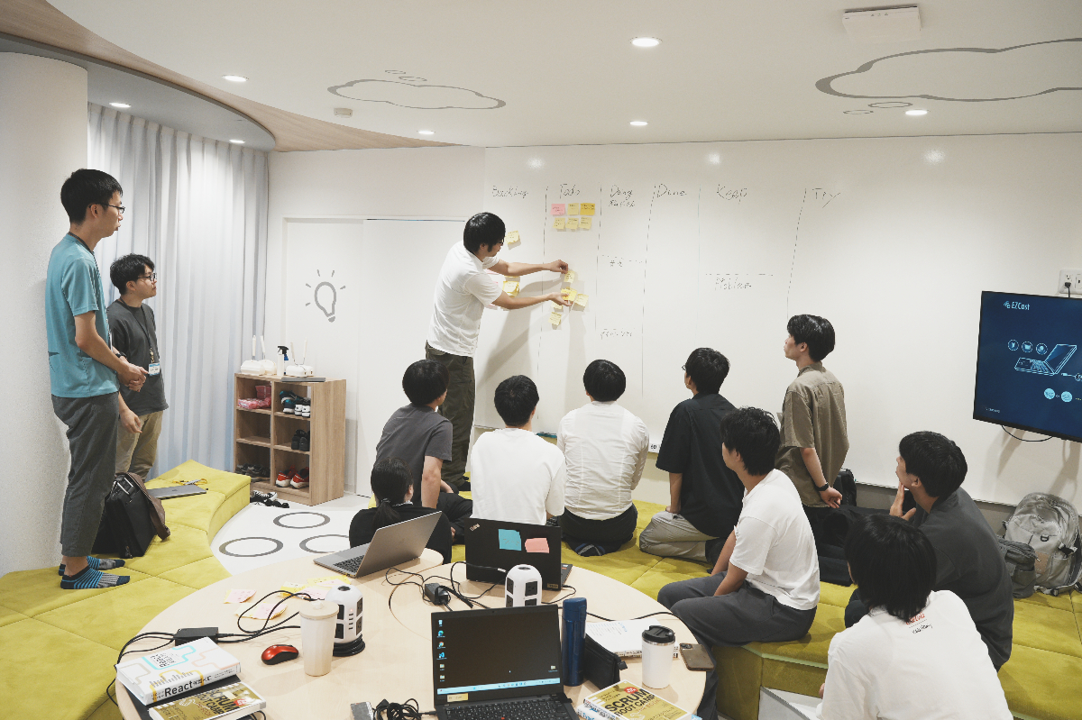 全員でホワイトボードを見て話し合いながらどのチームがどの機能を担当するか決めていくことで、スムーズにメンバー同士連携できるのがオフラインのメリットですね🙌